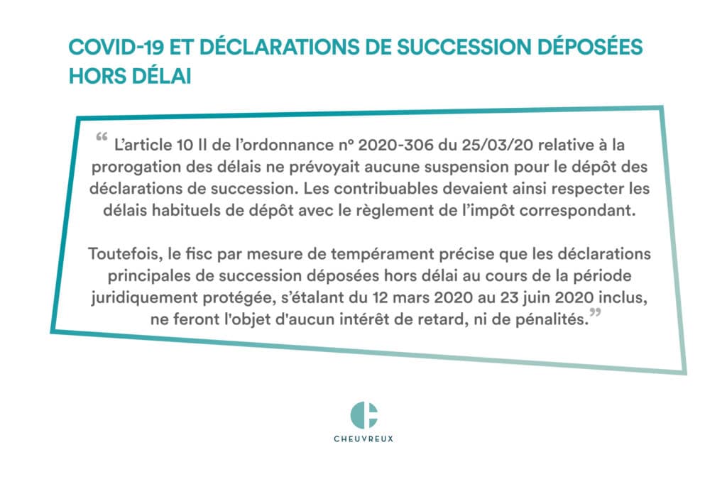 Il est notamment indiqué que « Les déclarations principales de succession déposées hors délai, du 12 mars au 23 juin 2020 inclus, ne font l’objet d’aucun intérêt de retard, ni de pénalités ».