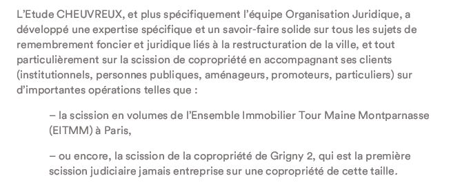 Le notaire reste, quant à lui, l’interlocuteur privilégié pour guider les différents acteurs pouvant solliciter la scission d’une copropriété, aussi bien dans leur stratégie que dans la mise en œuvre de leur projet, de la conception de celui-ci jusqu’à sa réalisation.