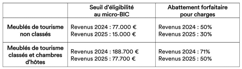 - Le chiffre d’affaires HT à ne pas dépasser pour l’éligibilité au micro-BIC sont établis à 15.000 € pour les meublés de tourisme non classés et à 77.700 € pour les meublées de tourisme classés et chambres d’hôtes,