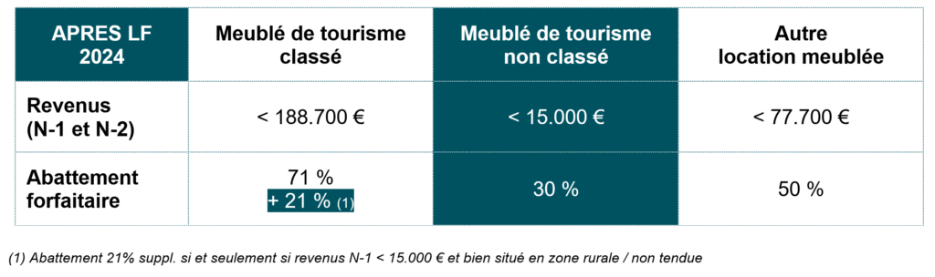 L’article 50-O du CGI est complété par l’alinéa 1-1°bis qui fixe un nouveau seuil à « 15.000 € s’il s’agit de la location directe ou indirecte de meublés de tourisme au sens de l’article L. 324-1-1 du Code du tourisme » avec un abattement forfaitaire limité à 30 %.