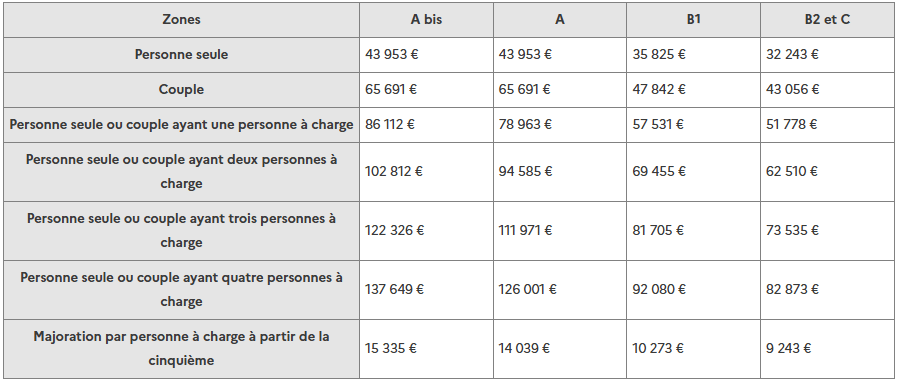 - Les locataires doivent respecter des plafonds de revenus fixés par l’Etat (décrets). Pour 2025, les seuils sont les suivants :
