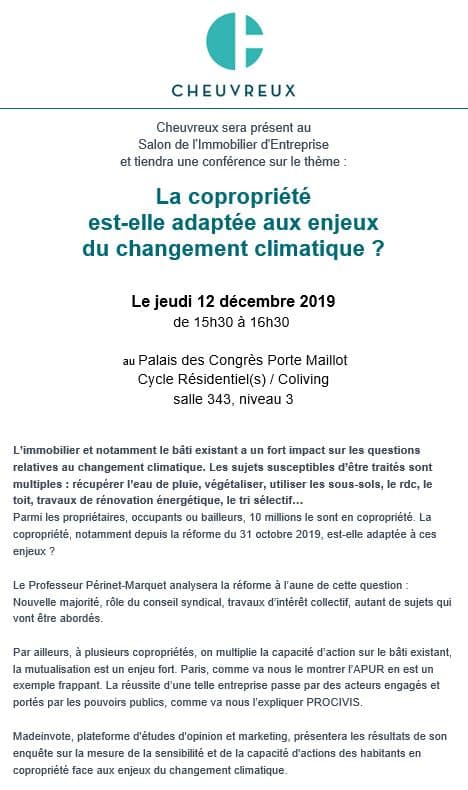 Ce jeudi 12 décembre à 15h30 au SIMI 2019, Cheuvreux vous invite à échanger sur le thème de la copropriété et du changement climatique.